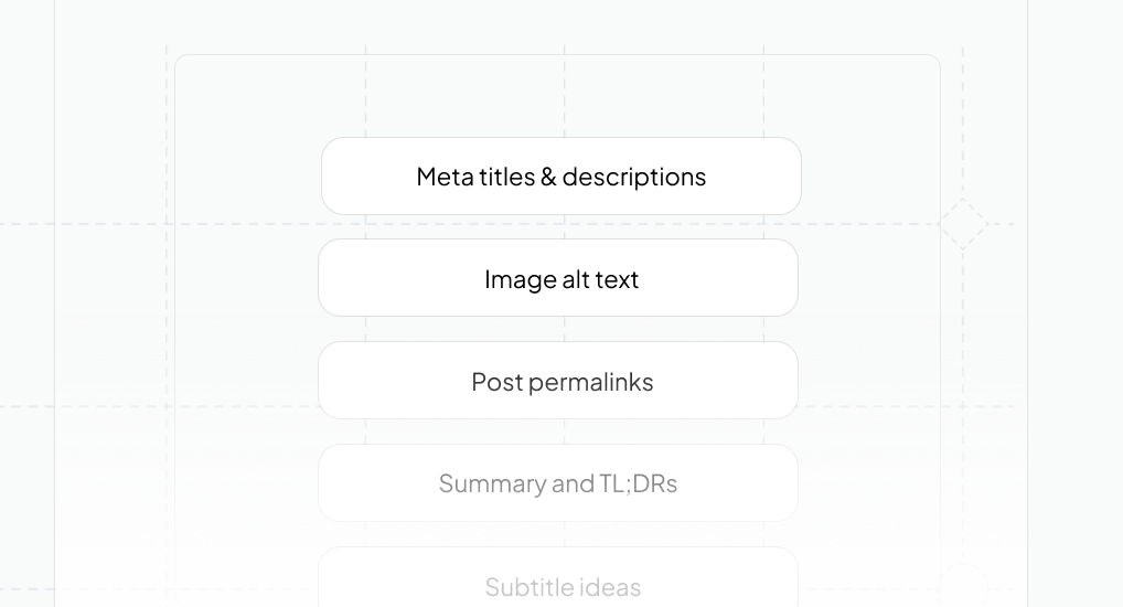 AI optimises your meta titles, permalinks, internal links, post summary and more. (Coming Soon)