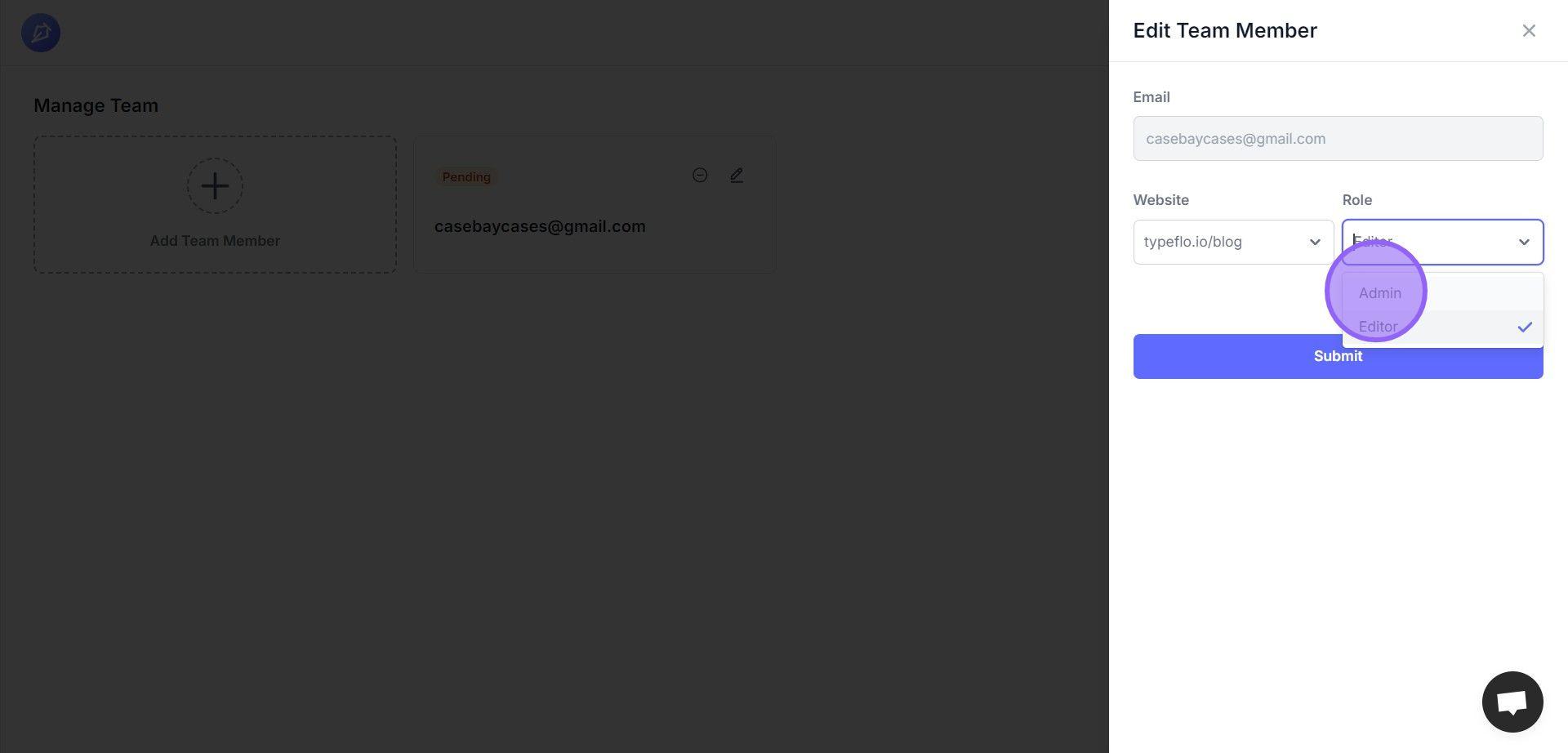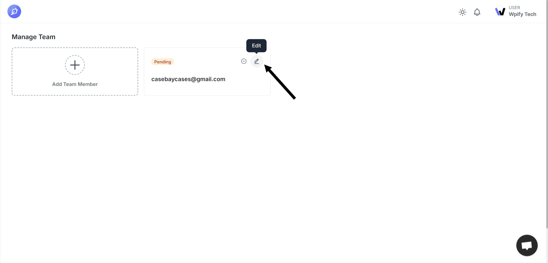 1. On the "Manage Team" members page, click on the "Edit" icon.