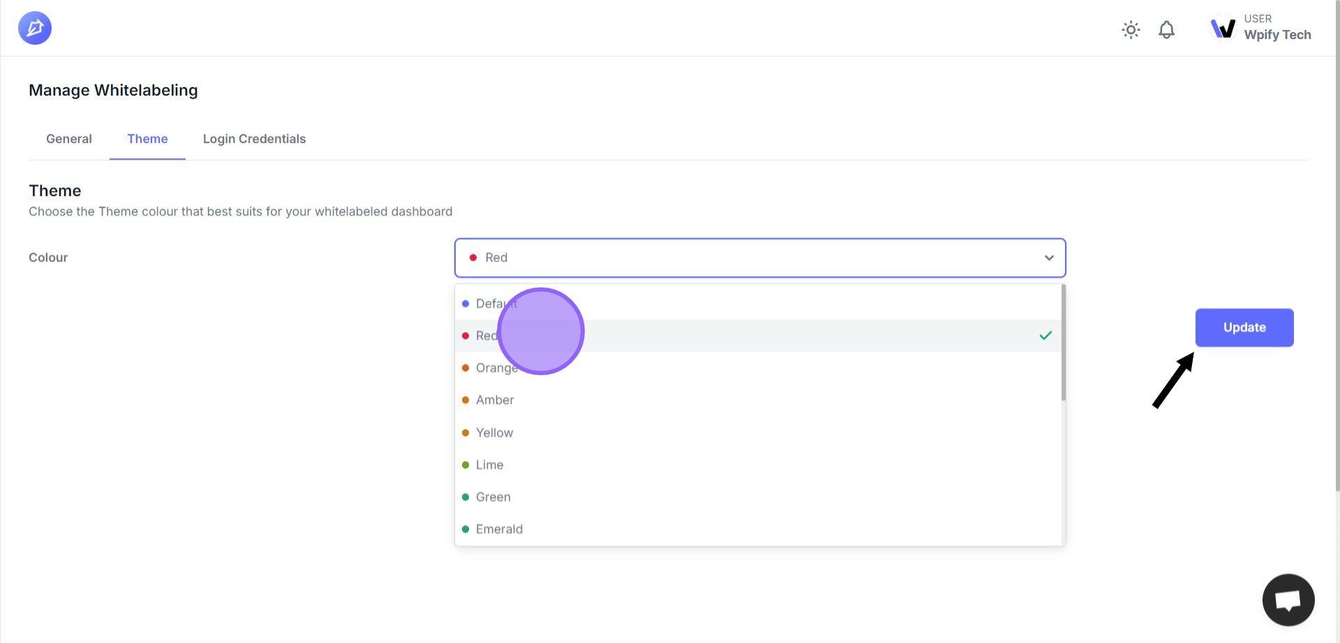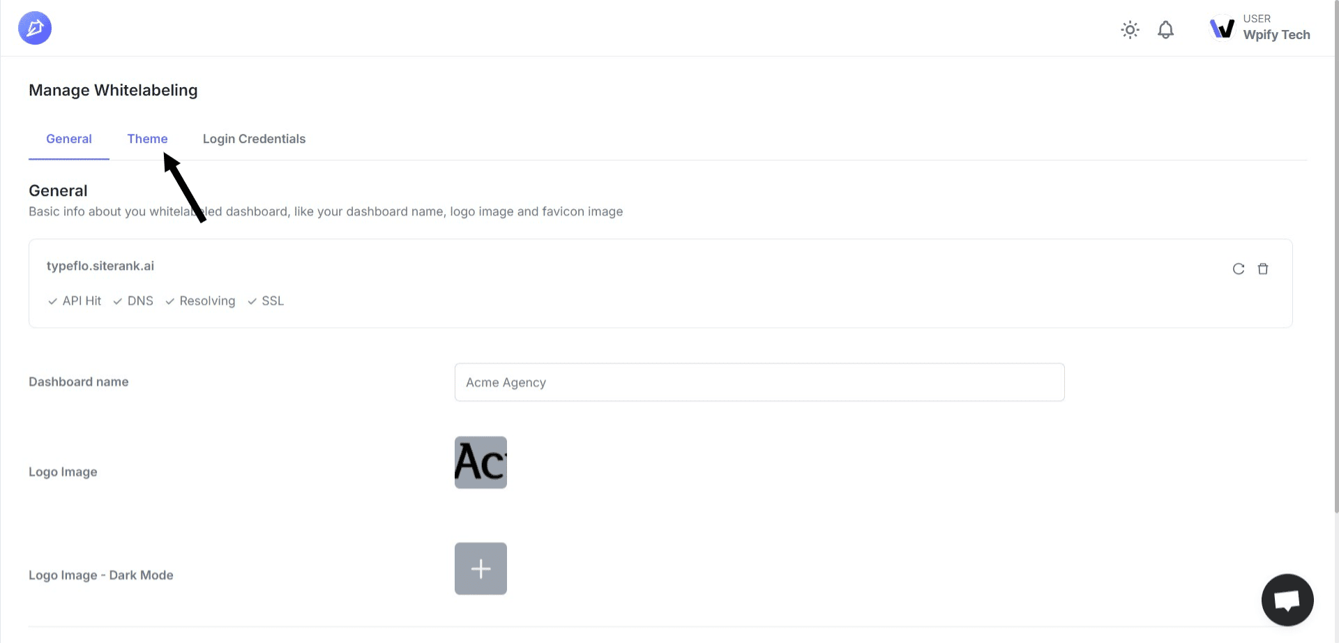 1. Once you are in the "Manage Whitelabeling" area, Click on "Theme"