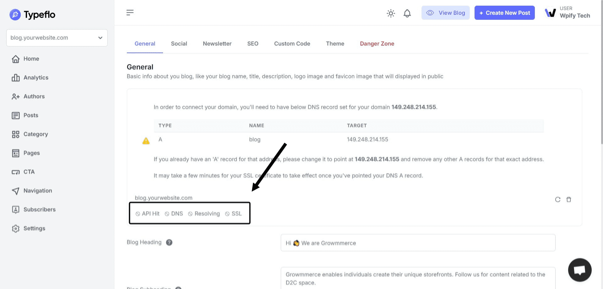 5. Once the domain is connected successfully, the icons in the below highlighted area will change to a "Green check" icon. If the same does not appear for you, please get in touch with us and we wil help you out.