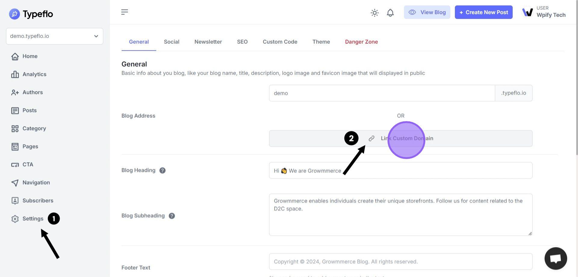1. Click on "Settings" in the side navigation, then click on "Link Custom Domain"