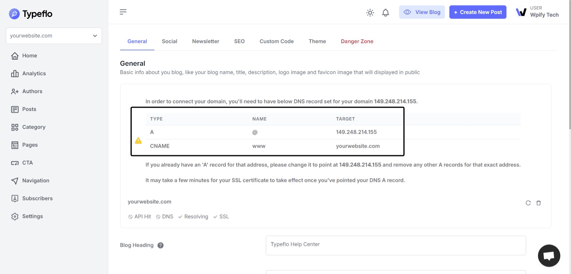 4. Once you have pasted the above values on your DNS, come back to the Typeflo dashhboard and click on the "Refresh" icon.