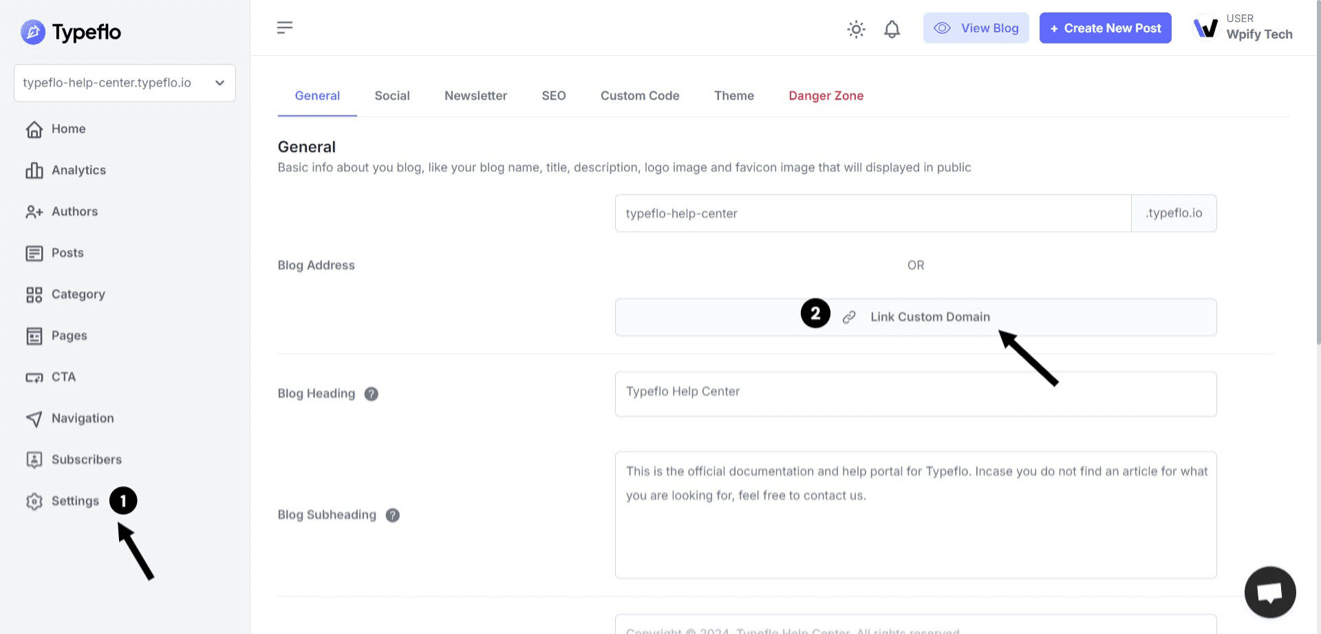 1. Click on "Settings" in the side navigation, then click on "Link Custom Domain"